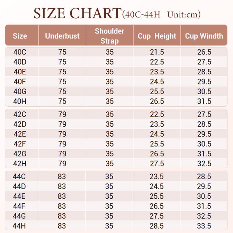 Size: 34C, 36C, 38C, 40C, 42C, 44C, 34D, 36D, 38D, 40D, 42D, 44D, 46D, 34DD, 36DD, 38DD, 40DD, 42DD, 44DD, 46DD, 34G, 36G, 38G, 40G, 42G, 44G, 34H, 36H, 38H, 40H, 42H, 44H, 46H