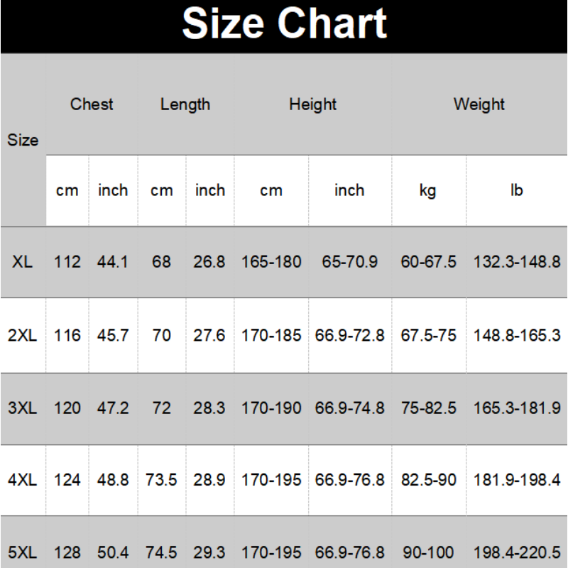 Size: XL, 2XL, 3XL, 4XL, 5XL